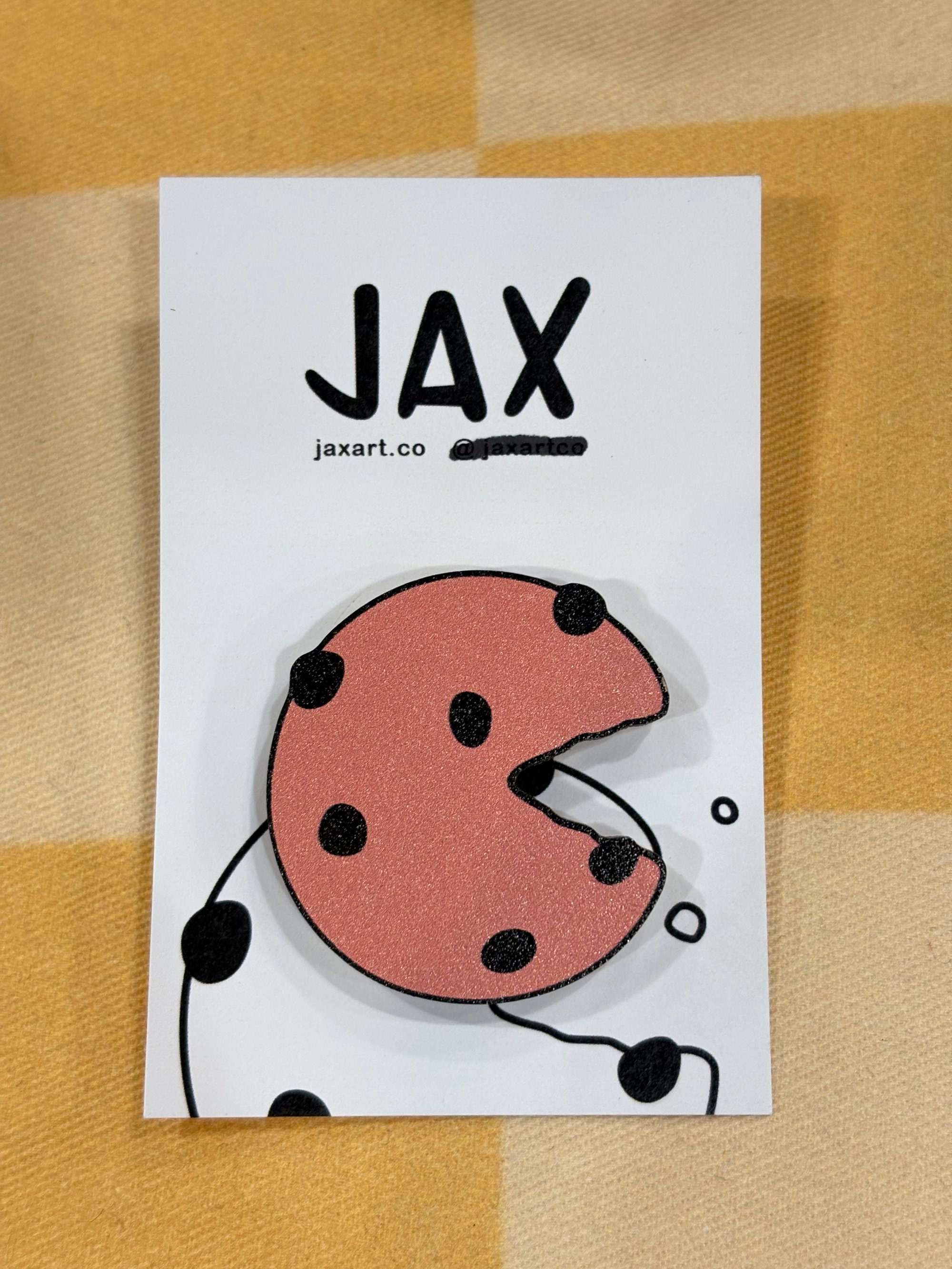 JAX cookie logo pin. A wooden pin made out of sustainably-sourced cherry.