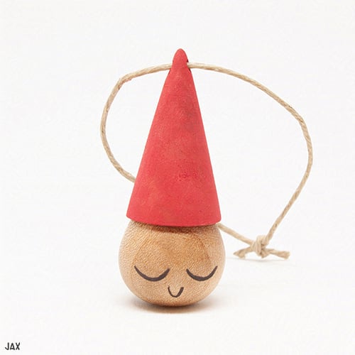 A sweet elf charm. Handmade out of sustainable maple and tied with hemp string.